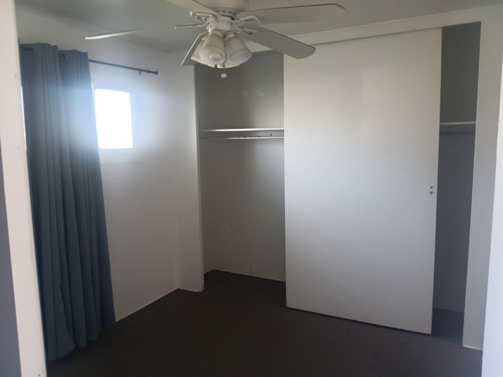 The carpeted Bedroom has a large closet, ceiling fan and windows.