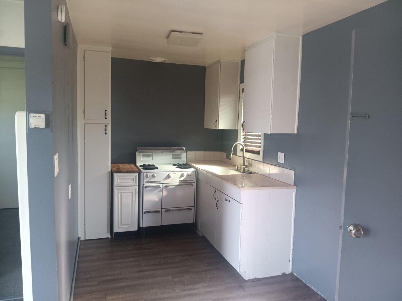 Kitchen also has laminate wood plank flooring.